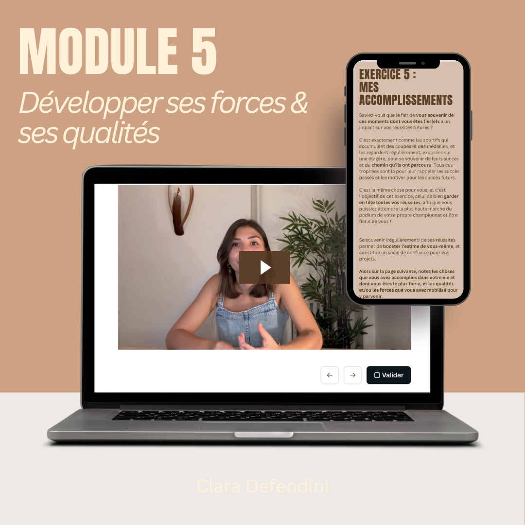 Dans ce module, vous apprendrez à mettre en lumière vos forces et vos qualités, grâce à toutes les ressources intégrées dans les précédents modules. En développant vos forces et vos qualités dans votre quotidien, votre estime et votre confiance en vous pourront continuer de grandir de jour en jour suite à ce programme.